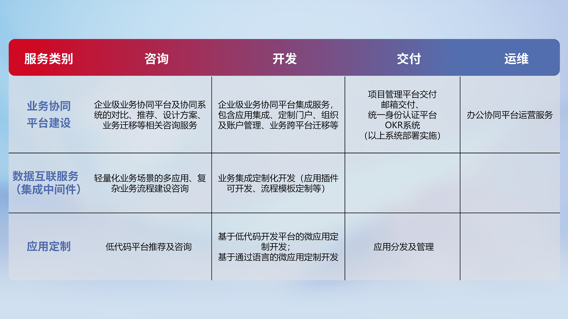 针对钉钉、、、、企微、、、、IDaas等平台级产品提供产品的规划、、方案、、、、交付、、、定制化开发等服务,,实现如统一协同办公、、、、智能客户服务、、混合会议管理、、、、智能数据查询、、等业务场景,,,实现数字化转型。。